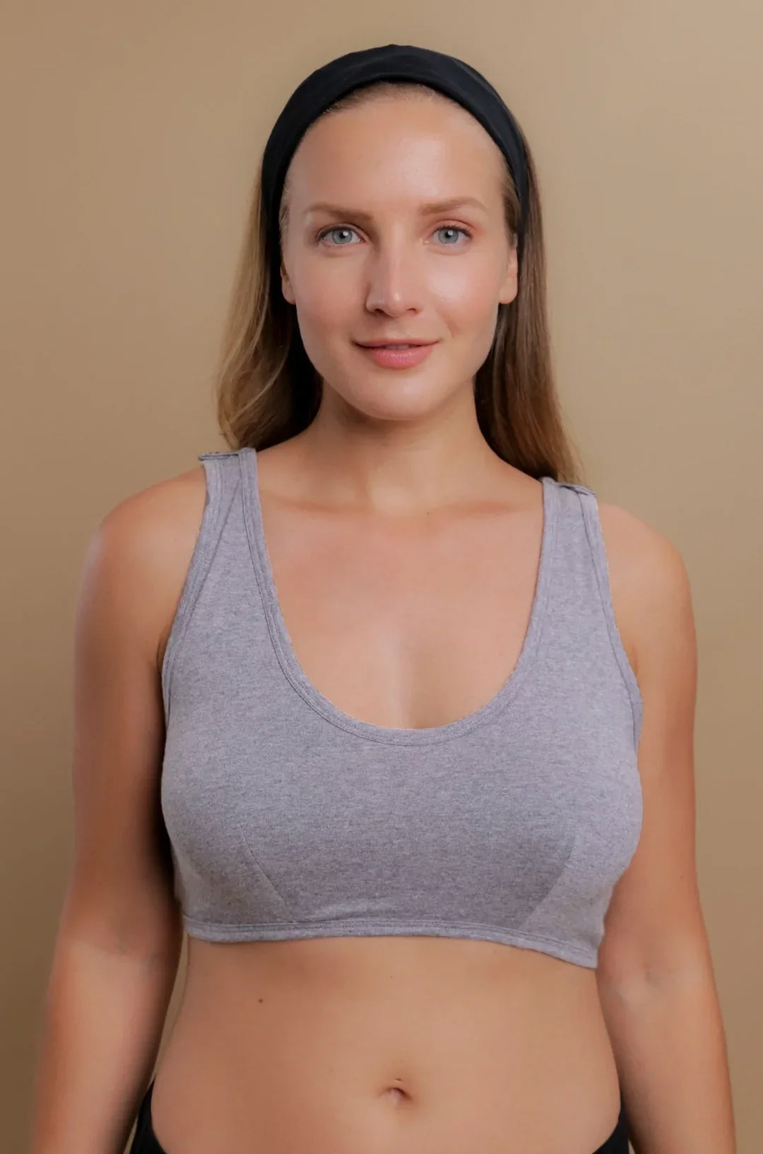 Woman wearing a hypoallergenic dark gray cotton bra from Cottonique against beige background